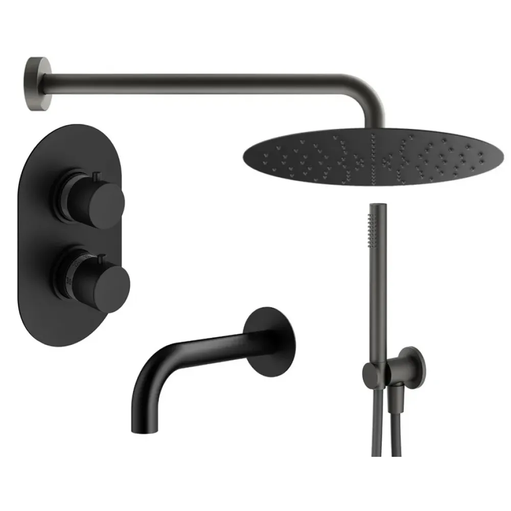 Комплект KITXOT19NO60 для ванны с изливом 210мм, смесителем XOT5050NO термостатическим на 3 выхода, душ 250мм, IXO, черный матовый Plumberia Selection