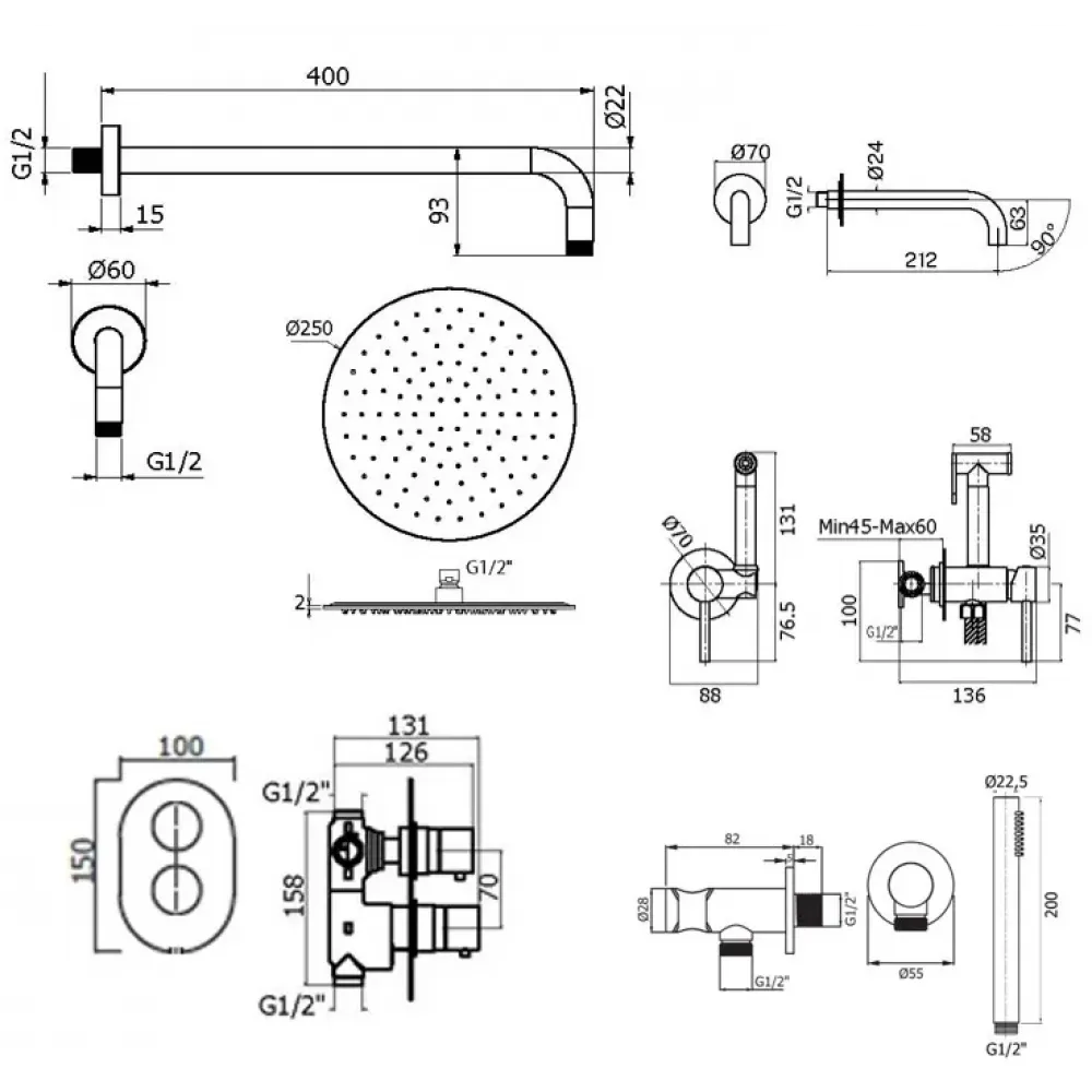 - XOT5050CR Смеситель термостат встраиваемый для душа 3 выхода в комплекте со встраиваемой частью, накладка овальная из нержавеющей стали, хром, Plumberia Selection