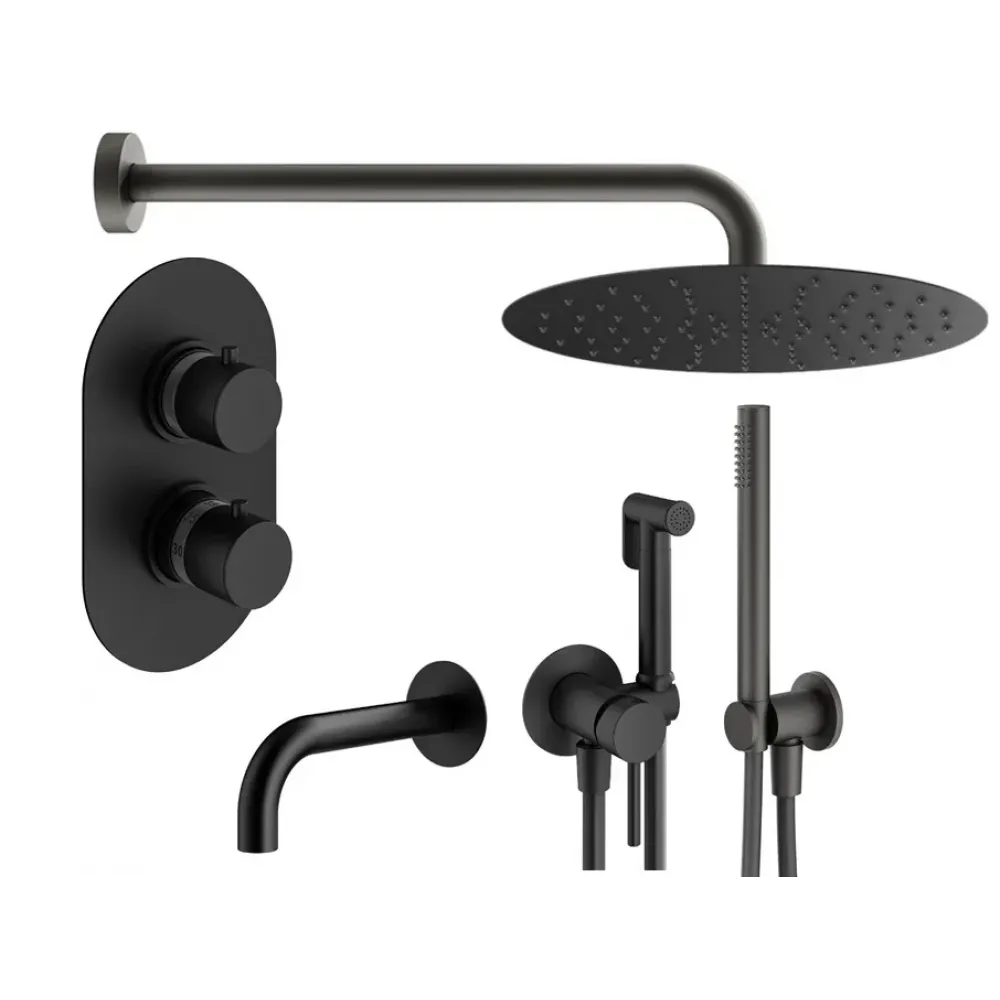 Комплект KITZXOT19NO260 с гигиеническим душем, для ванны с изливом 250мм, смесителем XOT5050NO термостатическим на 3 выхода, душ 250мм, IXO, черный матовый Plumberia Selection
