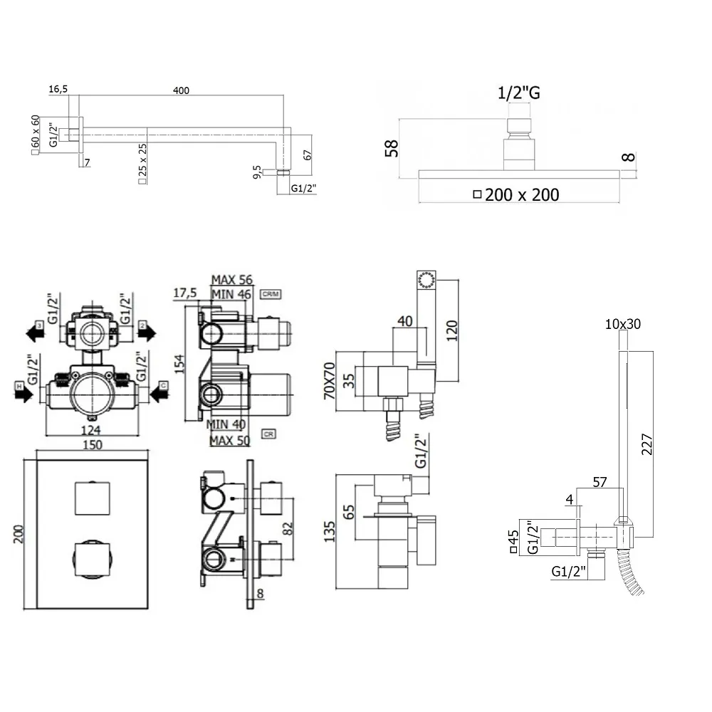 Комплект KITZLEQ518NO/M термостатический, с гигиеническим душем, для душа со смесителем LEQ518NO/M на 2 выхода, душ 200x200 мм