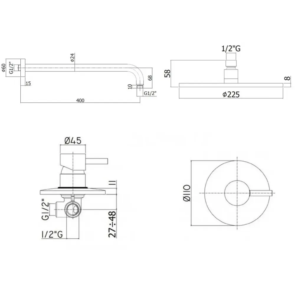 Комплект KITLIG011BO для душа, со смесителем LIG011BO на 1 выход, душ 225мм, LIGHT, белый матовый Paffoni