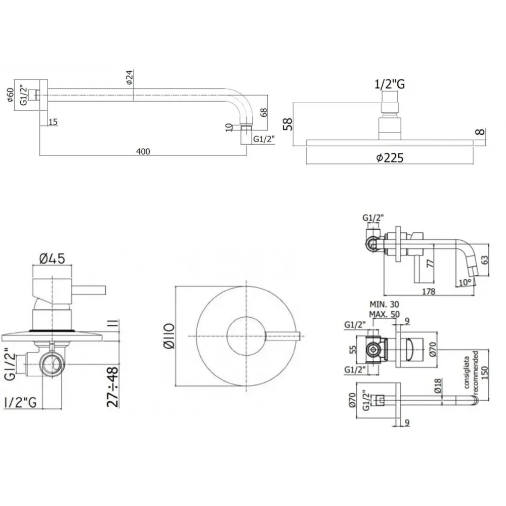 Комплект KITLIG011BO006 со встраиваемым смесителем для раковины LIG006BO70, смеситель для душа LIG011BO на 1 выход, душ 225мм, LIGHT, белый матовый P