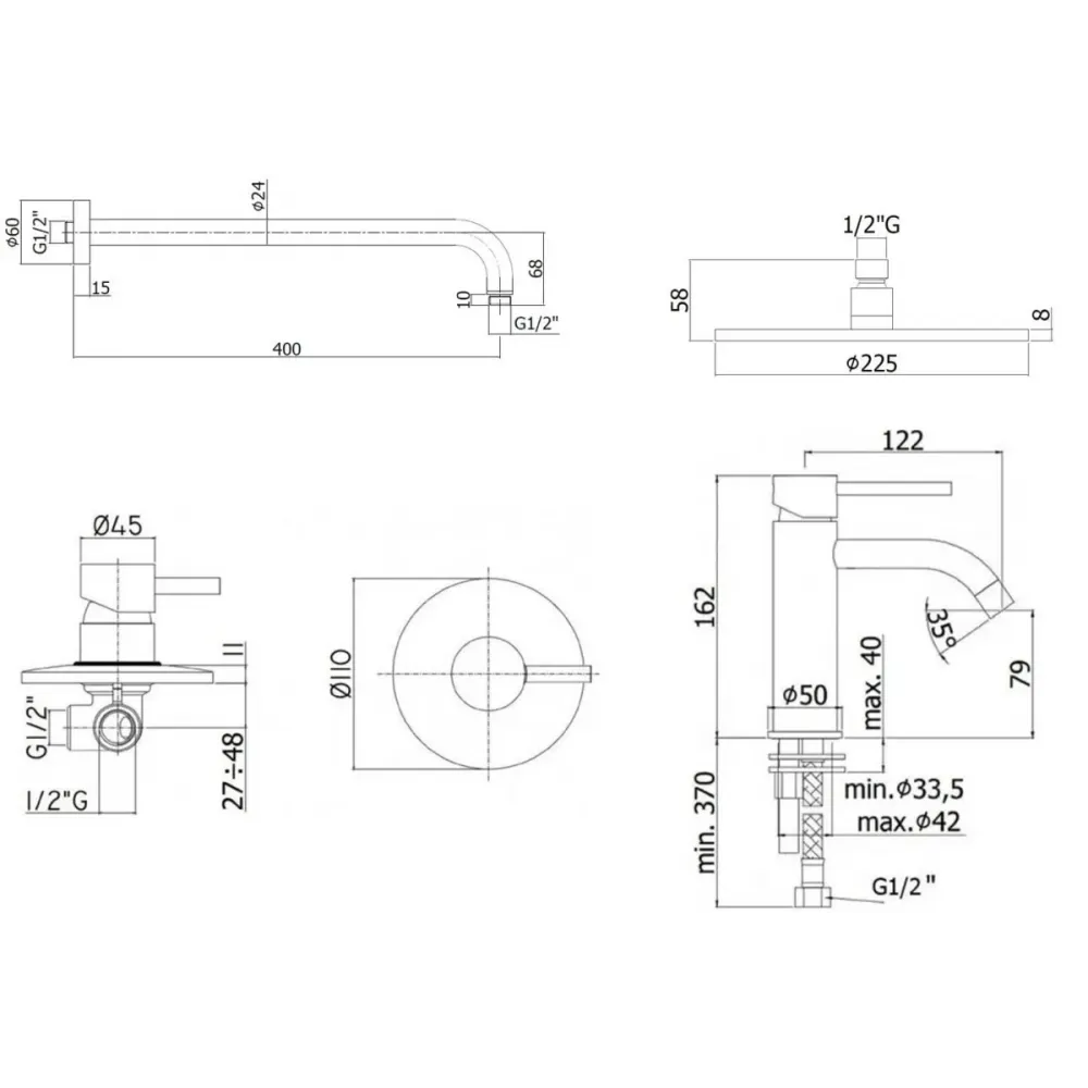 Комплект KITLIG011BO071 со смесителем для раковины LIG071BO, смеситель для душа LIG011BO на 1 выход, душ 225мм, LIGHT, белый матовый Paffoni