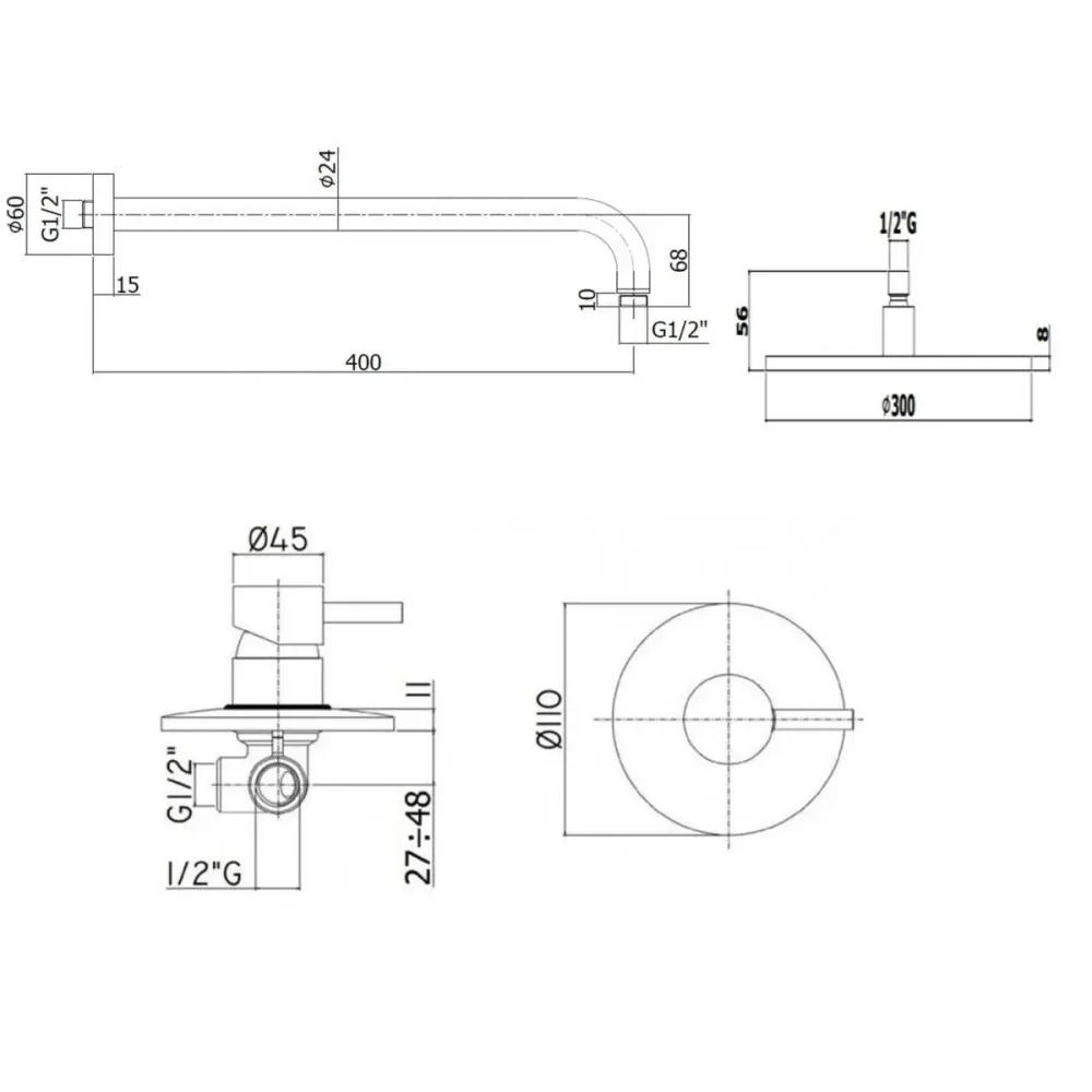 Комплект KITLIG011NOKING для душа, со смесителем LIG011NO на 1 выход, душ 300мм, LIGHT, черный матовый Paffoni