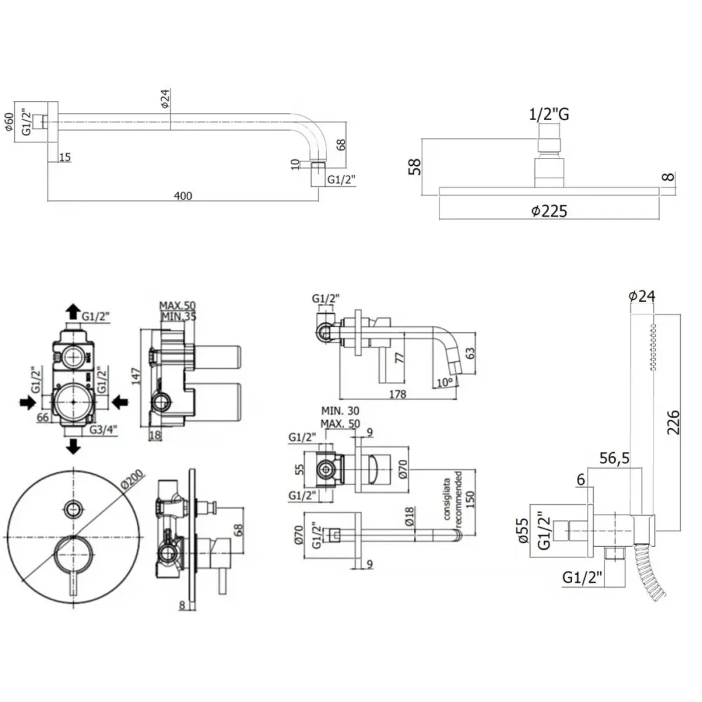 Комплект KITLIG015BO006 со встраиваемым смесителем для раковины LIG006BO70, смеситель для душа LIG015BO на 2 выхода, душ 225мм, LIGHT, белый матовый