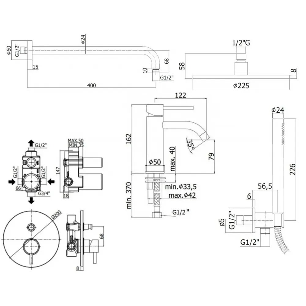 Комплект KITLIG015CR071 со смесителем для раковины LIG071CR, смеситель для душа LIG015CR на 2 выхода, душ 225мм, LIGHT, хром Paffoni