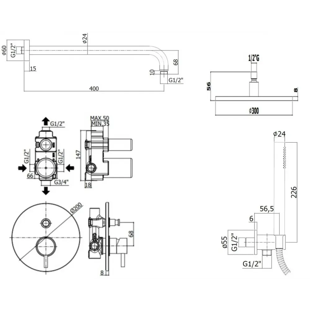 Комплект KITLIG015NOKING для душа со смесителем LIG015NO на 2 выхода, душ 300мм, LIGHT, черный матовый Paffoni