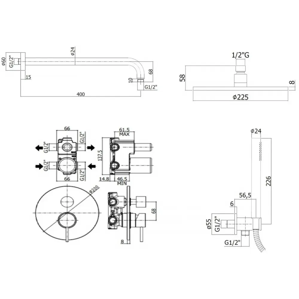 Комплект KITLIG018BO для душа со смесителем LIG018BO на 2 выхода, душ 225мм, LIGHT, белый матовый Paffoni