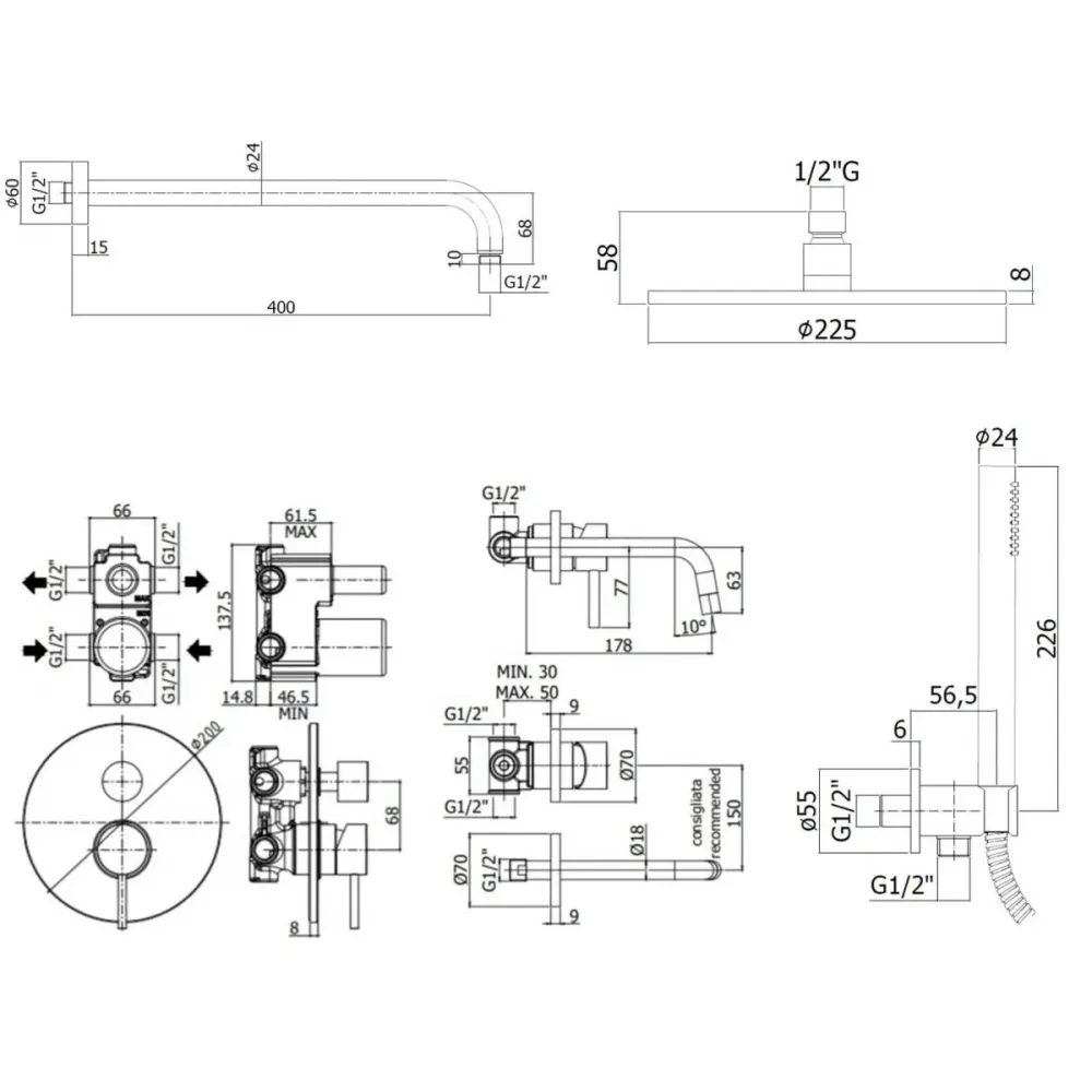 Комплект KITLIG018BO006 со встраиваемым смесителем для раковины LIG006BO70, смеситель для душа LIG018NO на 2 выхода, душ 225мм, LIGHT, белый матовый