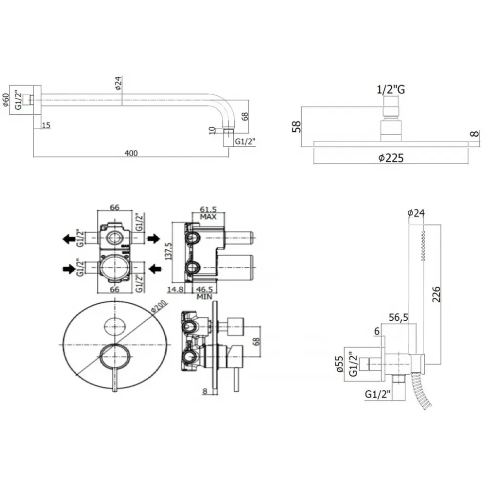 Комплект KITLIG018CR для душа со смесителем LIG018CR на 2 выхода, душ 225мм, LIGHT, хром Paffoni