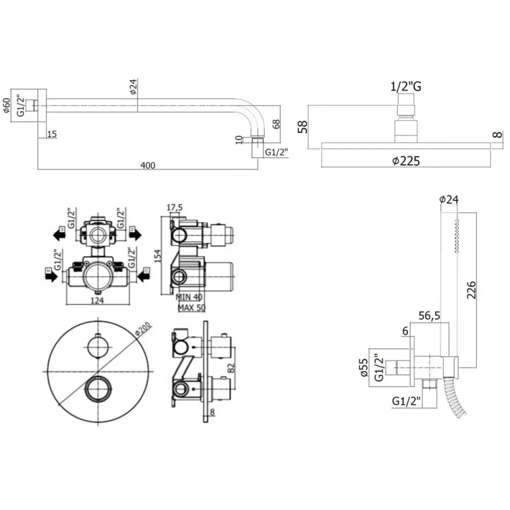 Комплект KITLIQ018BO для душа термостатический, со смесителем LIQ018BO на 2 выхода, душ 225мм, LIGHT, белый матовый Paffoni