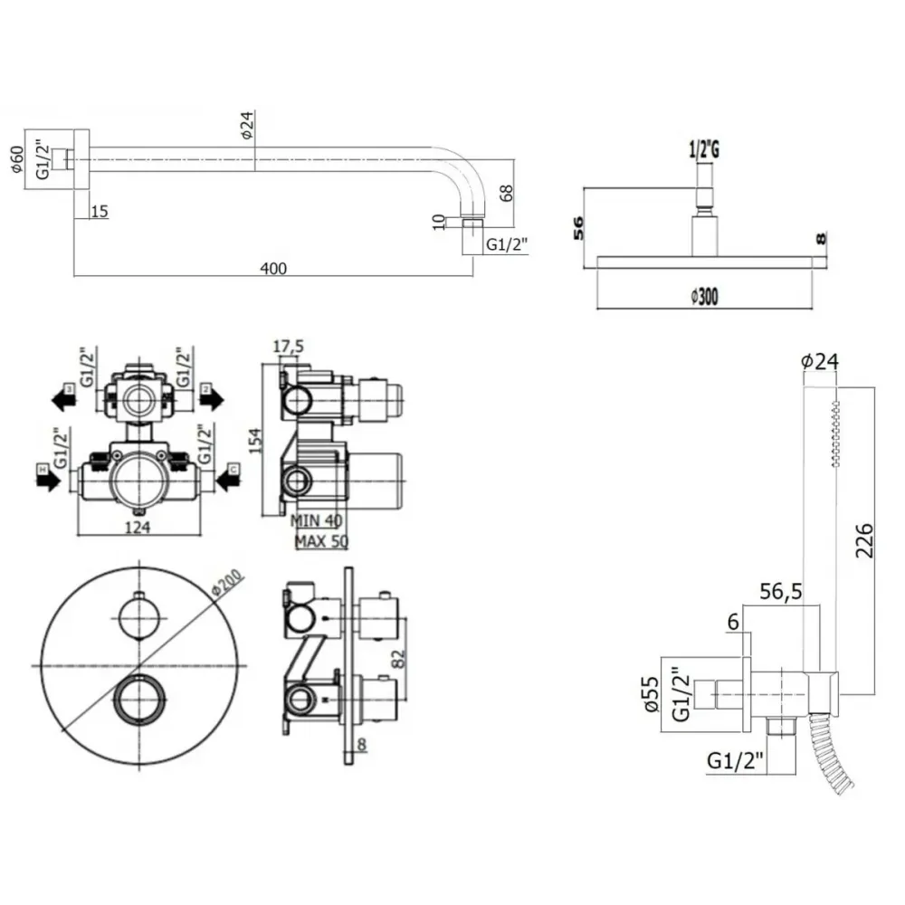 • LIQ018NO Light Смеситель термостат встраиваемый для душа 2 выход с накл. диам.200мм, черный матовый Paffoni
