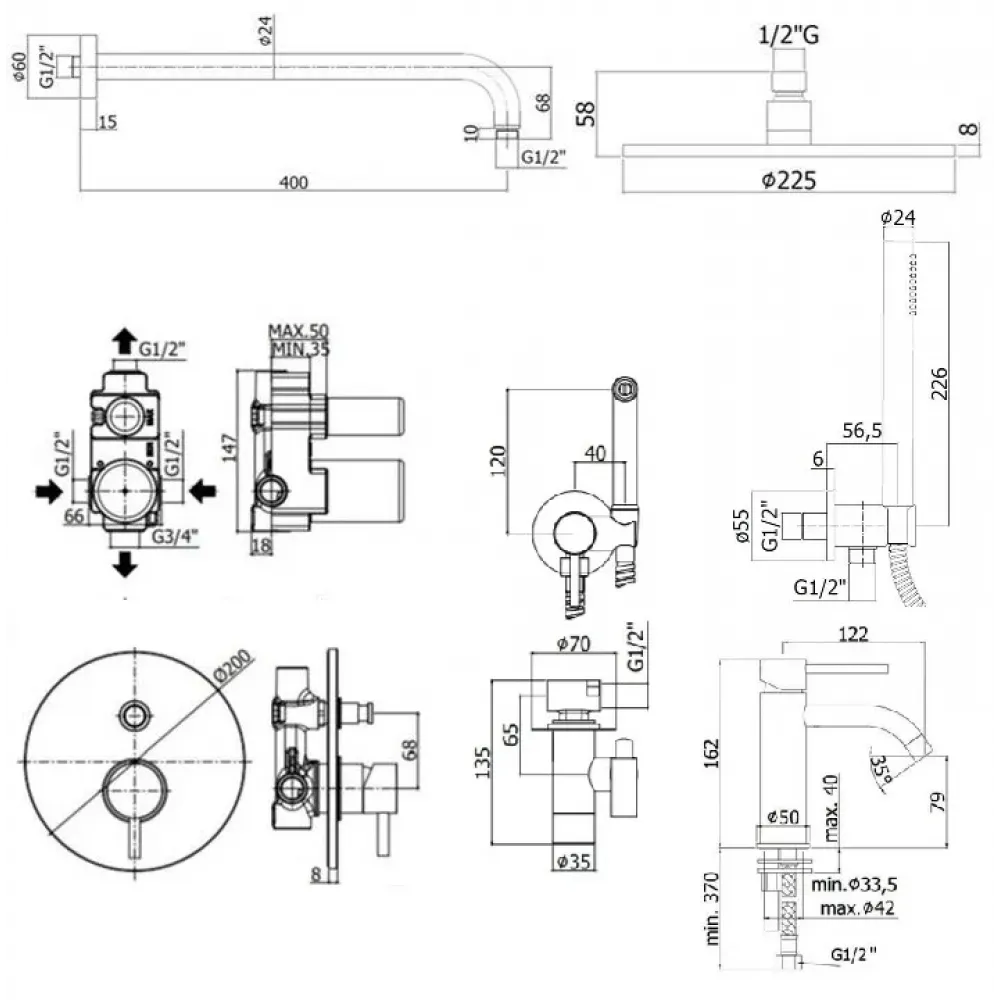 Комплект KITZLIG015CR071 с гигиен. душем, со смесителем LIG015CR на 2 выхода, душ 225мм, смеситель для раковины LIG071CR, LIGHT, хром Paffoni