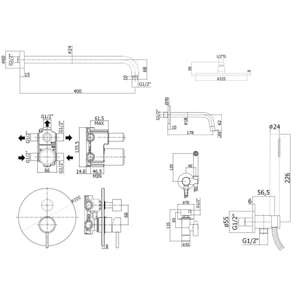 Комплект KITZLIG019CR045 для ванны с гигиеническим душем, с изливом 175мм, смеситель LIG019CR на 3 выхода, душ 225мм, LIGHT, хром Paffoni