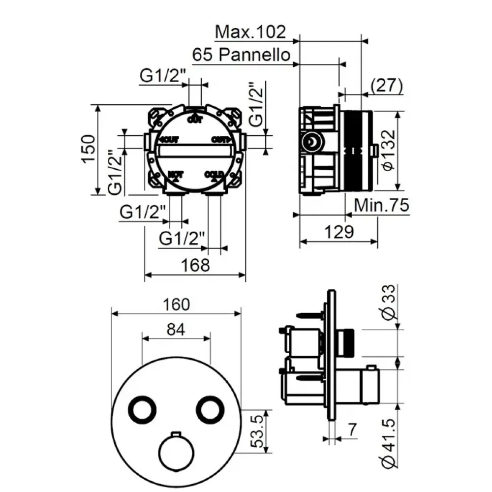 KITPSB1902CR Комплект встраиваемого термостатического смесителя для душа, 2 выхода с внутренней частью PSB003, кнопочное переключение с регулировкой расхода, накладка нержавеющая сталь d.160мм