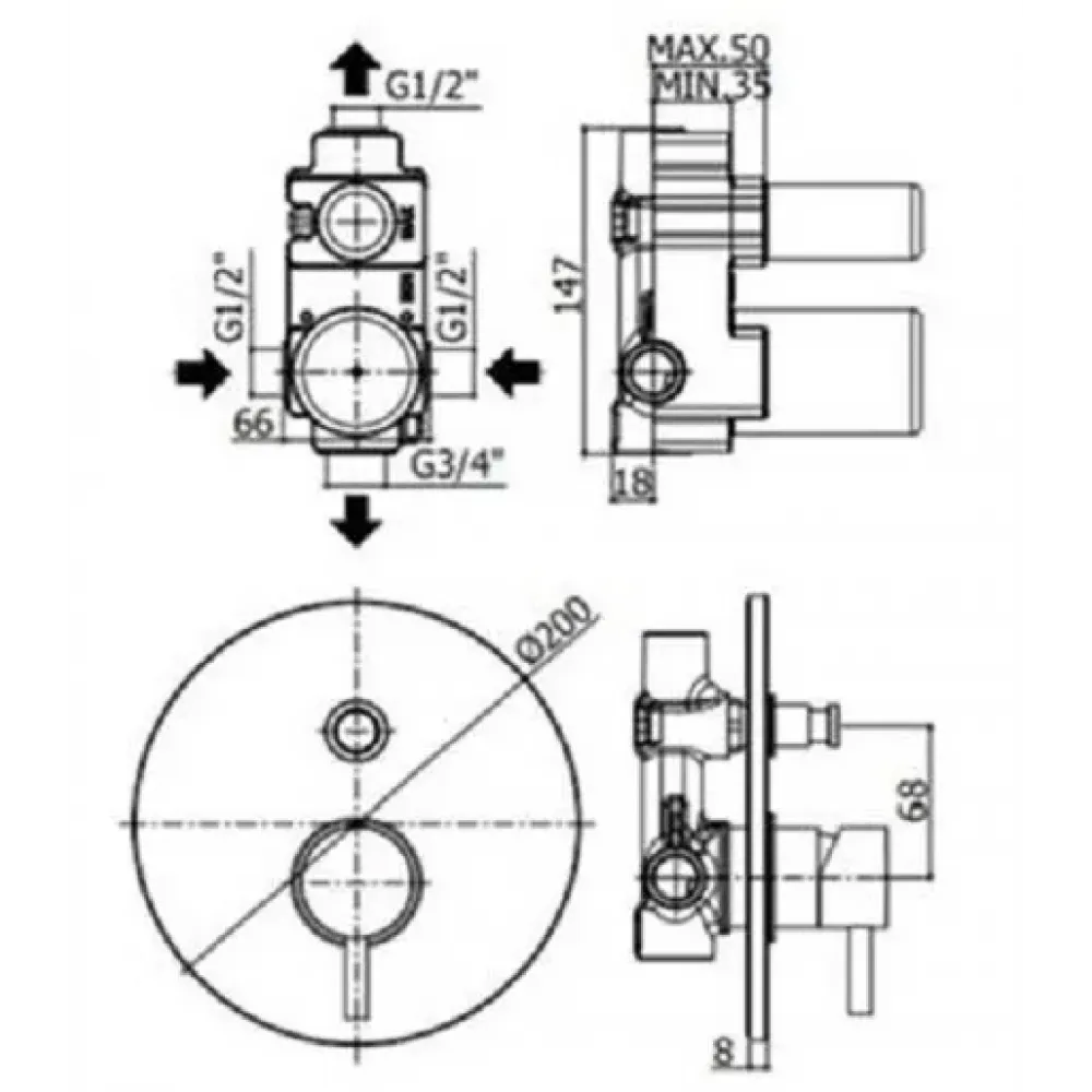 Смеситель для душа встраиваемый Paffoni Candy CA015CR на 2 выхода с накладкой латунной диаметр 200мм, девиатор-кнопка, хром
