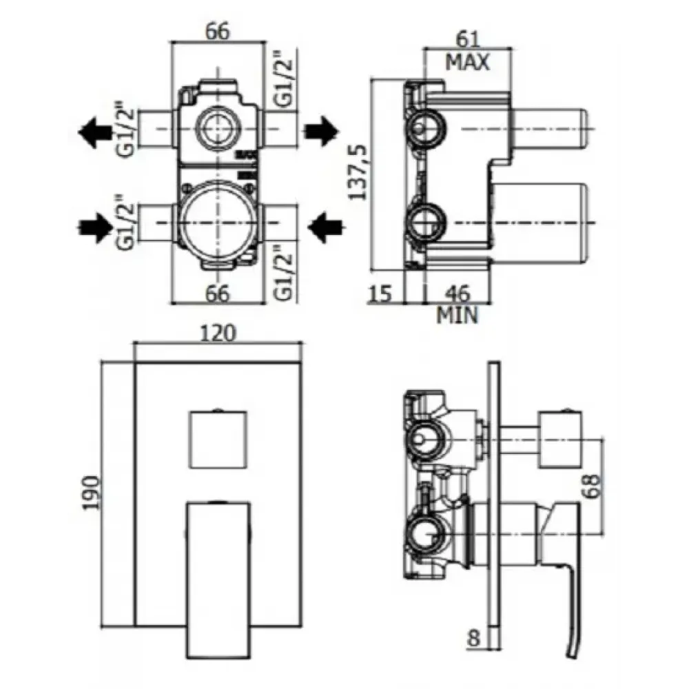 Смеситель для душа встраиваемый Paffoni Elle EL018CR/M на 2 выхода с накладкой из металла 120х190мм, девиатор-картридж на 2 положения + 1 комбо положение, хром
