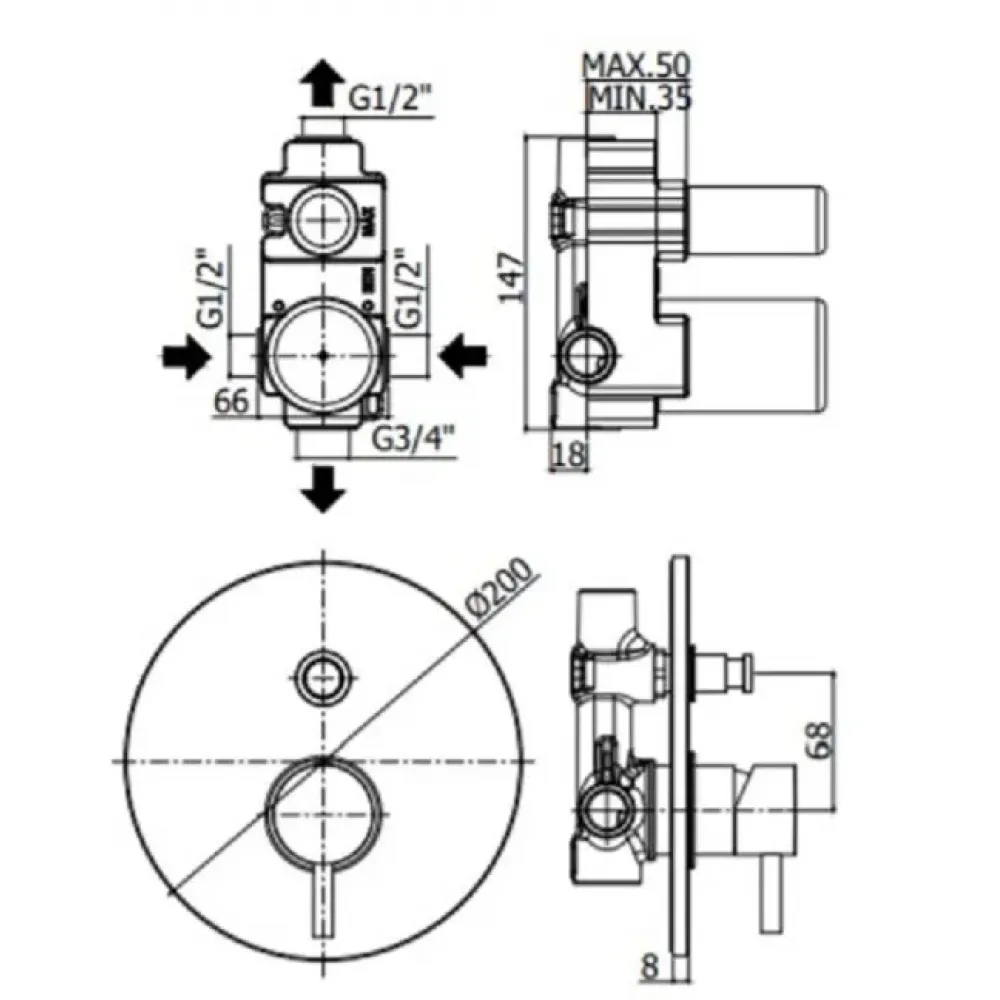 Смеситель для душа Paffoni Light LIG015BO встраиваемый на 2 выхода с накладкой из металла диаметр 200мм, девиатор-кнопка, белый матовый