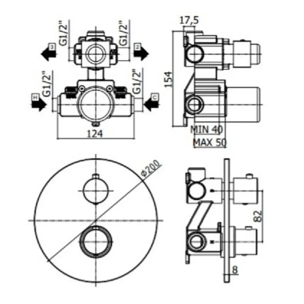 Смеситель для душа Paffoni Light LIQ018BO термостат встраиваемый на 2 выхода с накладкой из металла диаметр 200мм, девиатор-картридж, 2 положения+стоп, белый матовый