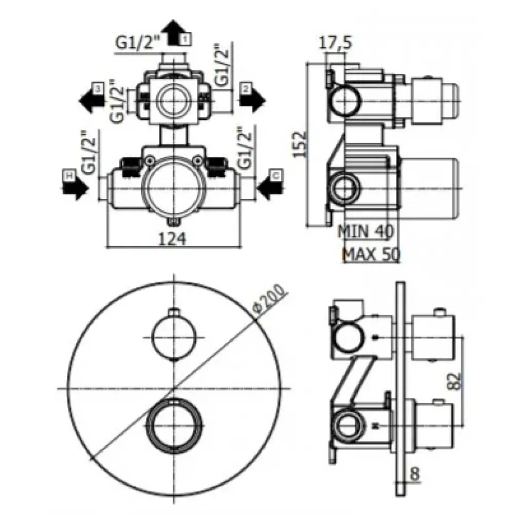 Смеситель для душа Paffoni Light LIQ019NO термостат встраиваемый на 3 выхода с накладкой из металла диаметр 200мм, девиатор-картридж, 3 положения+3 комбо со стоп, черный матовый