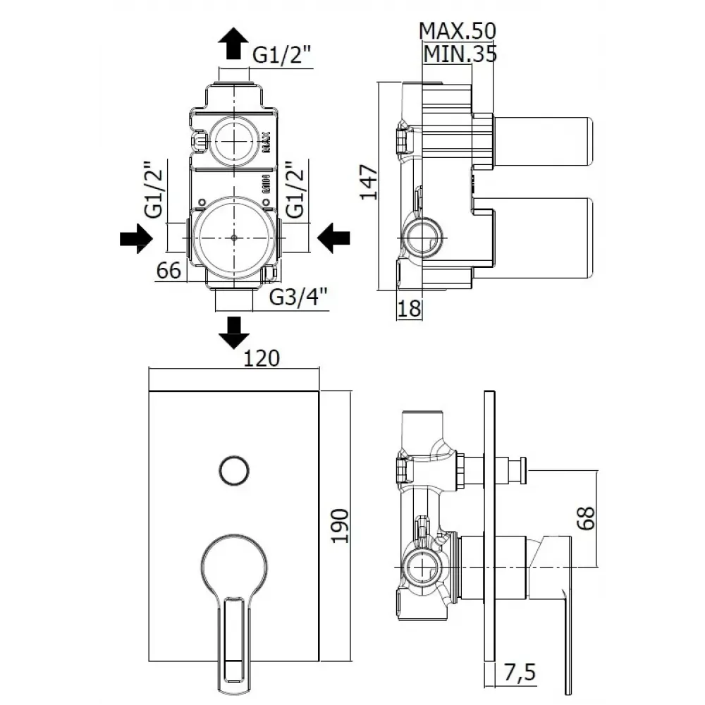 Смеситель для душа Paffoni Ringo RIN015NO/M встраиваемый на 2 выхода с накладкой из нержавеющей стали 120х190мм, девиатор-кнопка, черный матовый