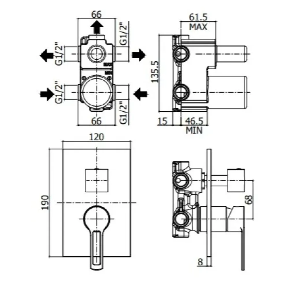Смеситель для душа Paffoni Ringo RIN019NO/M встраиваемый на 3 выхода с накладкой из нержавеющей стали 120х190мм, девиатор-картридж, 3 положения+3 комбо, черный матовый