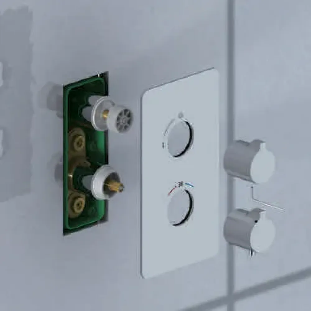 Встраиваемая душевая система с термостатом Timo Petruma 5019 относится к премиальному сегменту, предназначена для монтажа в полой или твердой стене. Термостатический картридж поддерживает стабильную температуру воды, обеспечивая максимально комфортные условия для принятия водных процедур. Встроенный потолочный душ большого размера создает имитацию проливного дождя, вода обливает человека целиком. Регулируя напор воды можно получить массажное воздействие, что очень полезно для здоровья. Основные преимущества встроенной системы: элегантный внешний вид, все коммуникации и крепления спрятаны в стену и потолок, снаружи видны только декоративные элементы. Установить встроенную систему можно в любом месте. Использовать такой смеситель очень удобно, регулировка температуры воды осуществляется ручкой термостата (расположена снизу). Режим "тропический душ" и увеличение напора осуществляется поворотом ручки дивертора (расположена сверху) влево. Для переключения в режим "излив" верните ручку дивертора в исходное положение 12:00 (смеситель выключен), а затем поверните вправо. Увеличение напора воды осуществляется поворотом ручки вправо. Для переключения потока воды с режима "излив" в режим "ручной душ", поверните излив к стене. Сложностей монтажа не возникает при установке элементов душевой системы опытным сантехником. Внимательно изучите инструкцию по монтажу и эксплуатации.