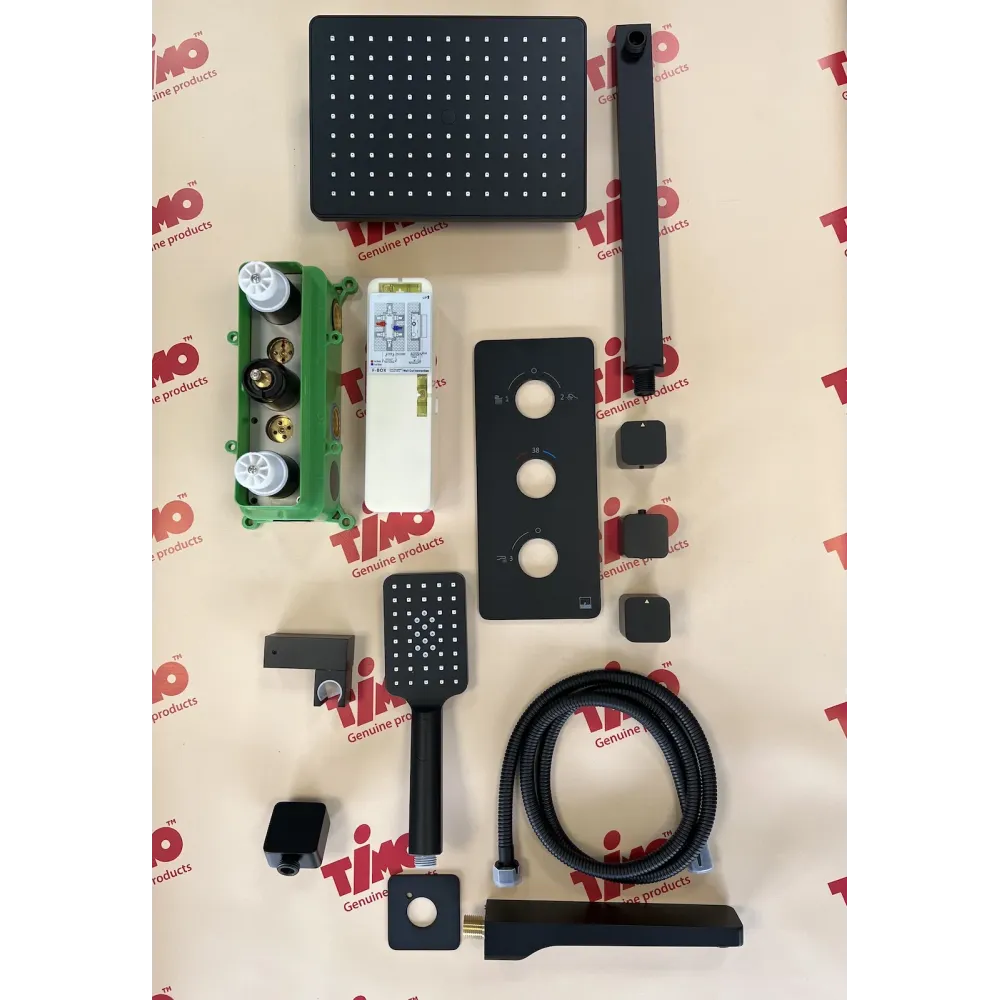 Душевая система с термостатом Timo Petruma 5049 относится к премиальному сегменту, предназначена для монтажа в полой или твердой стене. Термостатический картридж поддерживает стабильную температуру воды, обеспечивая максимально комфортные условия для принятия водных процедур. Основные преимущества встроенной системы: элегантный внешний вид, все коммуникации и крепления спрятаны в стену снаружи видны только декоративные элементы. Установить встроенную систему можно в любом месте. Использовать такой смеситель очень удобно, регулировка температуры воды осуществляется ручкой термостата (расположена по центру). Включение режима "тропический душ" и увеличение напора осуществляется поворотом ручки дивертора (расположена сверху) влево. Регулируя напор воды в режиме "тропический душ" можно получить массажное воздействие различной интенсивности. Для переключения в режим "ручной душ" верните ручку дивертора в исходное положение 12:00 (смеситель выключен), а затем поверните вправо. Увеличение напора воды осуществляется поворотом ручки вправо. Для включения режима "излив" поверните ручку дивертора (расположена снизу) с положения 12:00 (излив выключен) влево. Увеличение напора воды осуществляется поворотом ручки влево. Смеситель может работать в двух режимах одновременно "тропический душ"+"излив" или "тропический душ"+"ручной душ". Сложностей монтажа не возникает при установке элементов душевой системы опытным сантехником. Внимательно изучите инструкцию по монтажу и эксплуатации.