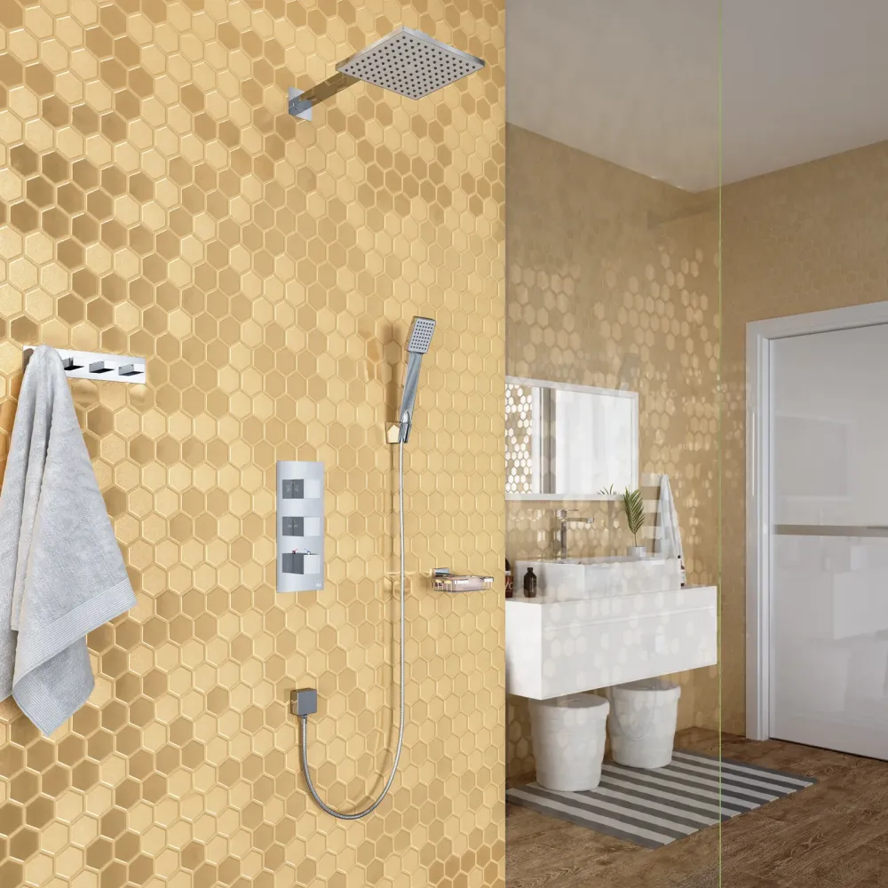 Душевая система с термостатом Tetra-thermo 0179, относится к премиальному сегменту, предназначена для монтажа в полой или твердой стене. Термостатический картридж поддерживает стабильную температуру воды, обеспечивая максимально комфортные условия для принятия водных процедур. Регулируя напор воды в режиме "тропический душ" можно получить массажное воздействие различной интенсивности. Основные преимущества встроенной системы: элегантный внешний вид, все коммуникации и крепления спрятаны в стену снаружи видны только декоративные элементы. Установить встроенную систему можно в любом месте. Использовать такой смеситель очень удобно, регулировка температуры воды осуществляется ручкой термостата (расположена снизу). Включение режима "тропический душ" осуществляется поворотом ручки дивертора (расположена сверху) вправо. Для переключения в режим "ручной душ" верните ручку дивертора в исходное положение 12:00, затем поверните влево. В исходном положении 12:00 режим "тропический душ" и "ручной душ" выключен. Увеличение напора воды осуществляется поворотом ручки (расположена по центру) влево. В исходном положении 12:00 смеситель выключен. Сложностей монтажа не возникает при установке элементов душевой системы опытным сантехником. Внимательно изучите инструкцию по монтажу и эксплуатации.