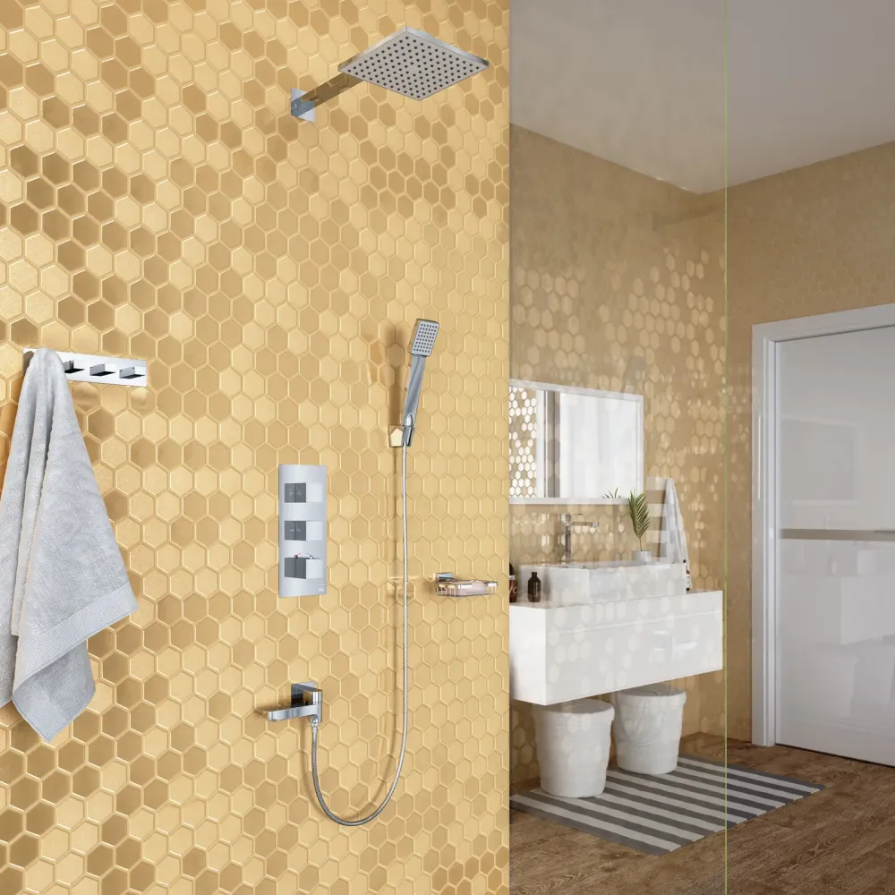 Душевая система с термостатом Tetra-thermo 0199, относится к премиальному сегменту, предназначена для монтажа в полой или твердой стене. Термостатический картридж поддерживает стабильную температуру воды, обеспечивая максимально комфортные условия для принятия водных процедур. Регулируя напор воды в режиме "тропический душ" можно получить массажное воздействие различной интенсивности. В комплектацию душевой системы входит излив, с его помощью можно наполнить ванну, ведро воды и т.д. Основные преимущества встроенной системы: элегантный внешний вид, все коммуникации и крепления спрятаны в стену снаружи видны только декоративные элементы. Установить встроенную систему можно в любом месте. Использовать такой смеситель очень удобно, регулировка температуры воды осуществляется ручкой термостата (расположена снизу). Включение режима "тропический душ" осуществляется поворотом ручки дивертора (расположена сверху) вправо. Для переключения в режим "излив" верните ручку дивертора в исходное положение 12:00, затем поверните влево. В исходном положении 12:00 режим "тропический душ" и "излив" выключен. Для пеключения потока воды с излива на ручную лейку, поверните излив к стене. Увеличение напора воды осуществляется поворотом ручки (расположена по центру) влево. В исходном положении 12:00 смеситель выключен. Сложностей монтажа не возникает при установке элементов душевой системы опытным сантехником. Внимательно изучите инструкцию по монтажу и эксплуатации.