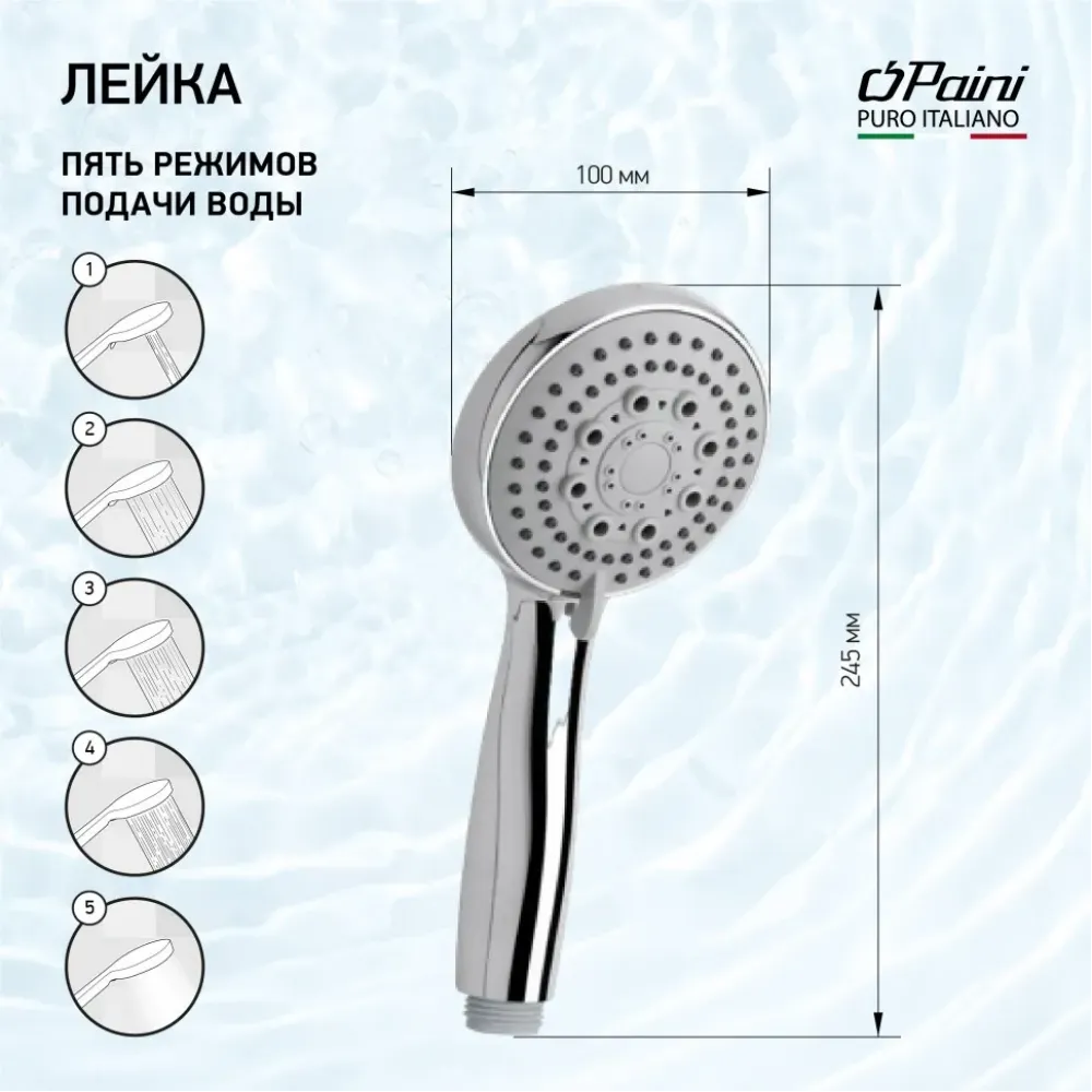Лейка изготовлена из прочного пластика ABS и оснащена 5 режимами подачи воды: равномерным, мягким аэрированным, жестким массажным, мягким массажным и смешанным потоками воды. Мы рекомендуем рассмотреть дополнительно к покупке душевую стойку так же фабрики "ПАИНИ" в цвет. Стойка поможет регулировать высоту расположения лейки по высоте.
