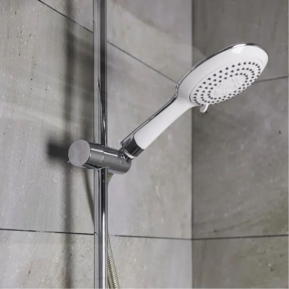 Дизайн лейки также заслуживает особого внимания. Ее поверхность покрыта комбинацией хрома и белого покрытия, что придает ей элегантный и стильный вид. Этот душевой комплект будет прекрасно сочетаться с любым интерьером в ванной комнате.