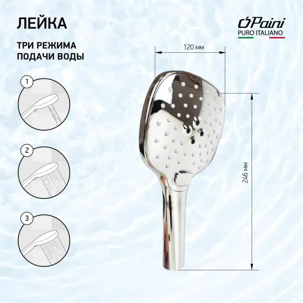 Душевая лейка PAINI с 3 режимами подачи воды.