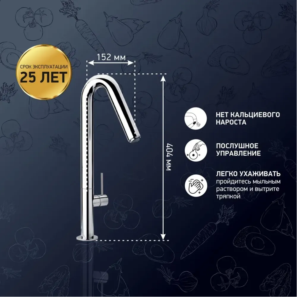 - Высокий корпус и поворотный излив дает больше возможностей при использовании на кухне.