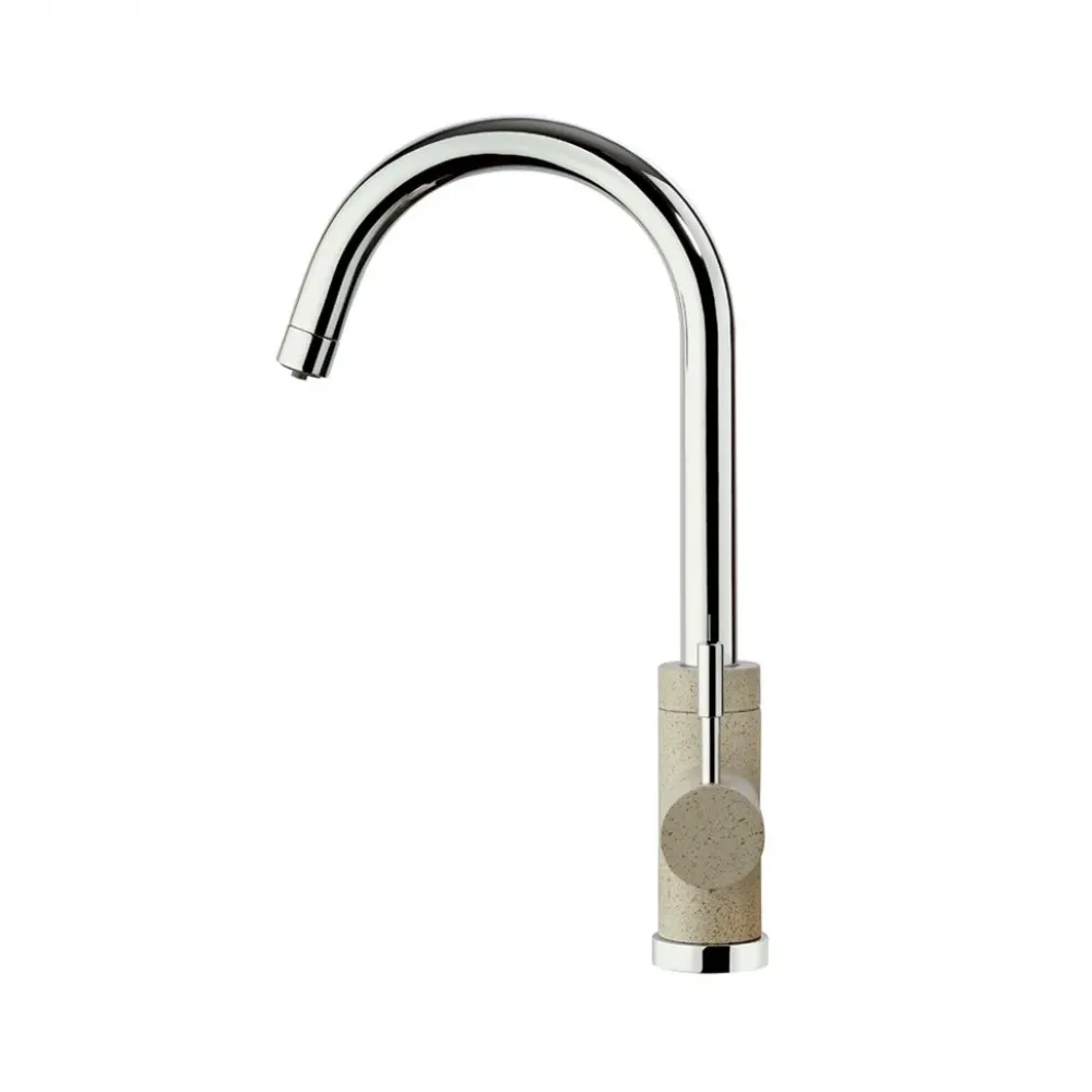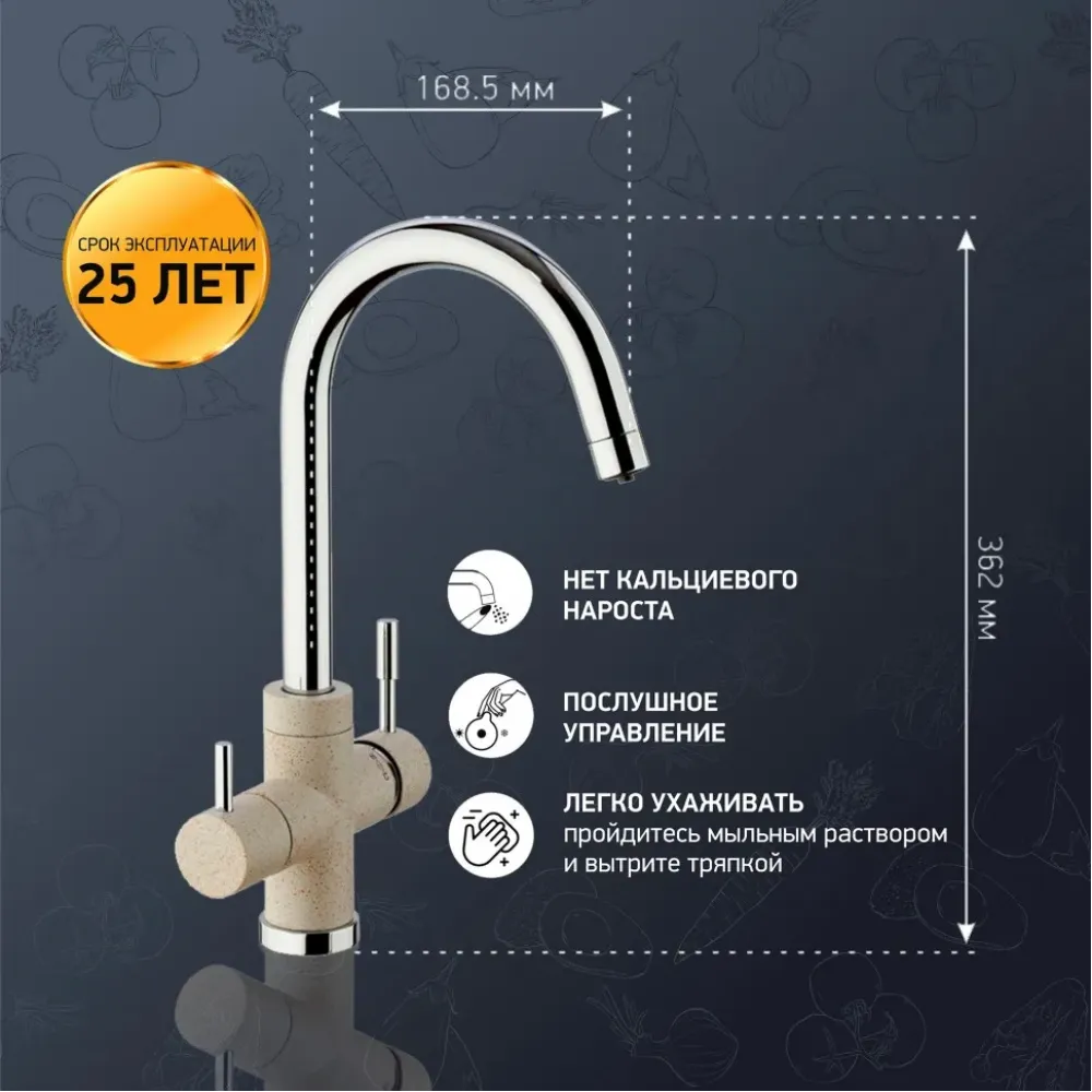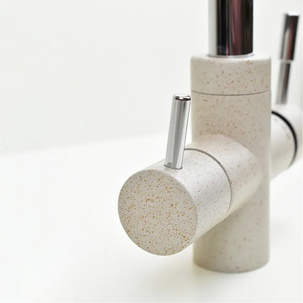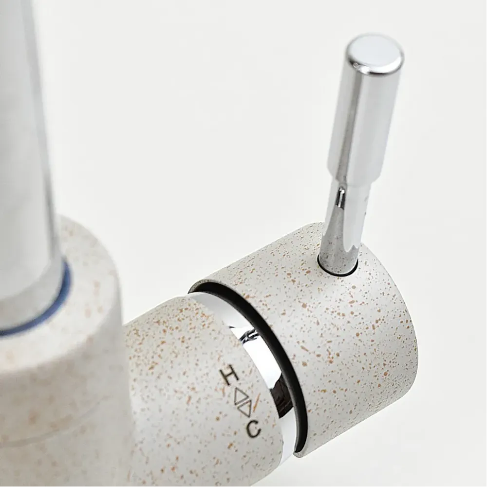 Три варианта бежевого цвета: сахара, бежевый с вкраплениями (гранит) и нежный трюфель, а также белый с вкраплениями (гранит) и комбинация черного и хромого цветов в корпусе смесителя. Теперь точно получится попасть в цвет столешницы и/или цвет мойки либо создать контрастные сочетания. Все варианты покрытия, включая покрытие под камень, выполнены по специальной технологии, сохраняющей цвет и фактуру надолго и облегчающей уход за смесителем.