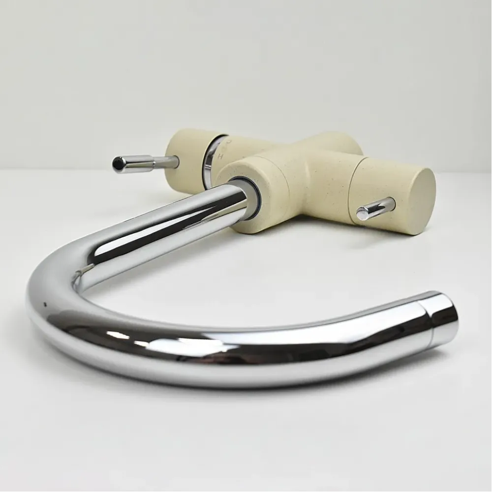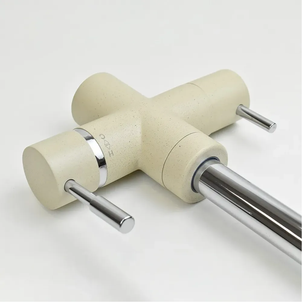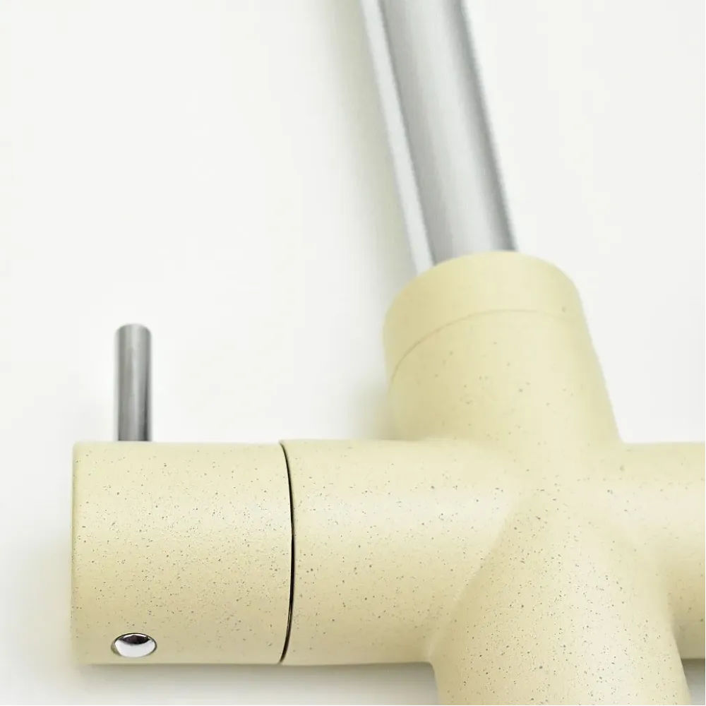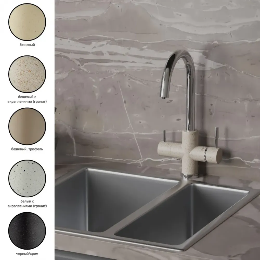 Три варианта бежевого цвета: сахара, бежевый с вкраплениями (гранит) и нежный трюфель, а также белый с вкраплениями (гранит) и комбинация черного и хромого цветов в корпусе смесителя. Теперь точно получится попасть в цвет столешницы и/или цвет мойки либо создать контрастные сочетания. Все варианты покрытия, включая покрытие под камень, выполнены по специальной технологии, сохраняющей цвет и фактуру надолго и облегчающей уход за смесителем.