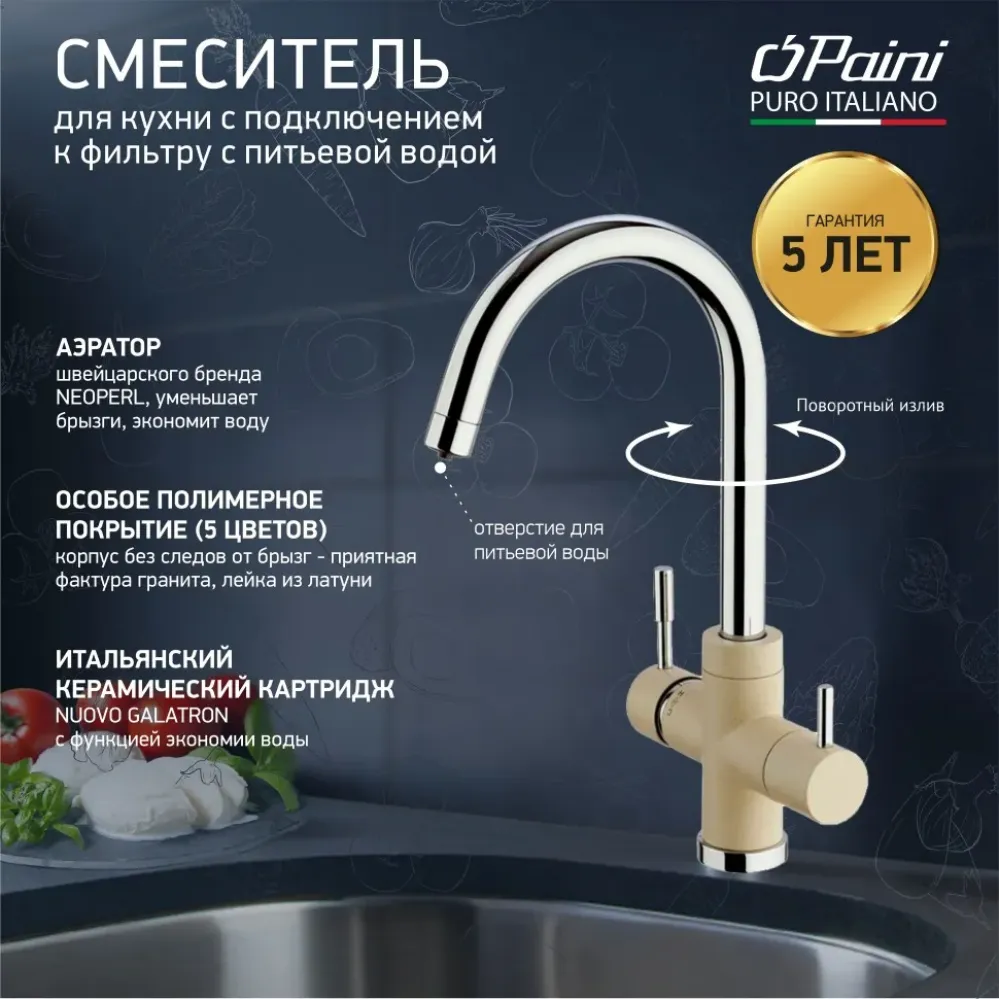 Оптимизируем мокрую зону на кухне со смесителем PAINI COX на 3 воды! Однорычажный смеситель классической формы, но с одной важной деталью: фильтр для воды подключается прямо к смесителю. Легкий монтаж без дополнительных отверстий в столешнице, теперь для доступа к питьевой воде нужно просто повернуть рычаг на корпусе смесителя. Смеситель представлен в необычных цветах, что дает простор творчеству и позволяет сочетать его с мойками и кухонной мебелью разных фактур и материалов.