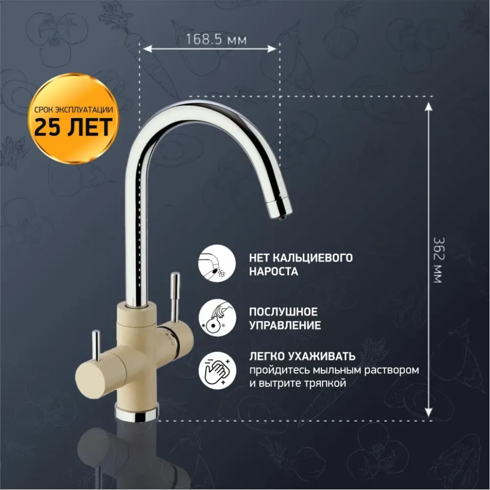 | Тип изделиясмеситель для кухни | Тип управления клавишейоднорычажный | Цветбежевый матовый |
