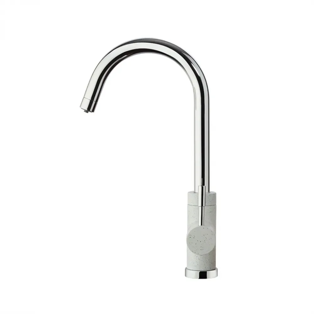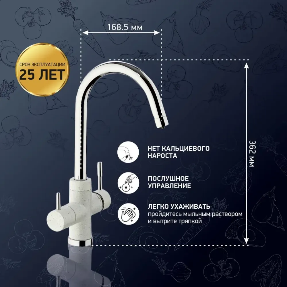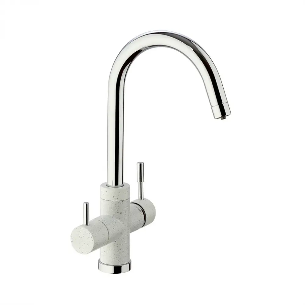 Три варианта бежевого цвета: сахара, бежевый с вкраплениями (гранит) и нежный трюфель, а также белый с вкраплениями (гранит) и комбинация черного и хромого цветов в корпусе смесителя. Теперь точно получится попасть в цвет столешницы и/или цвет мойки либо создать контрастные сочетания. Все варианты покрытия, включая покрытие под камень, выполнены по специальной технологии, сохраняющей цвет и фактуру надолго и облегчающей уход за смесителем.