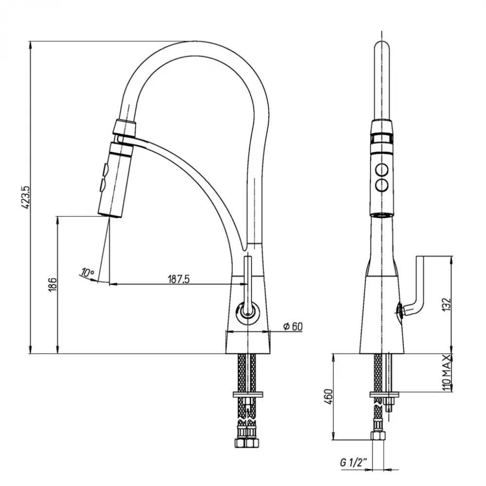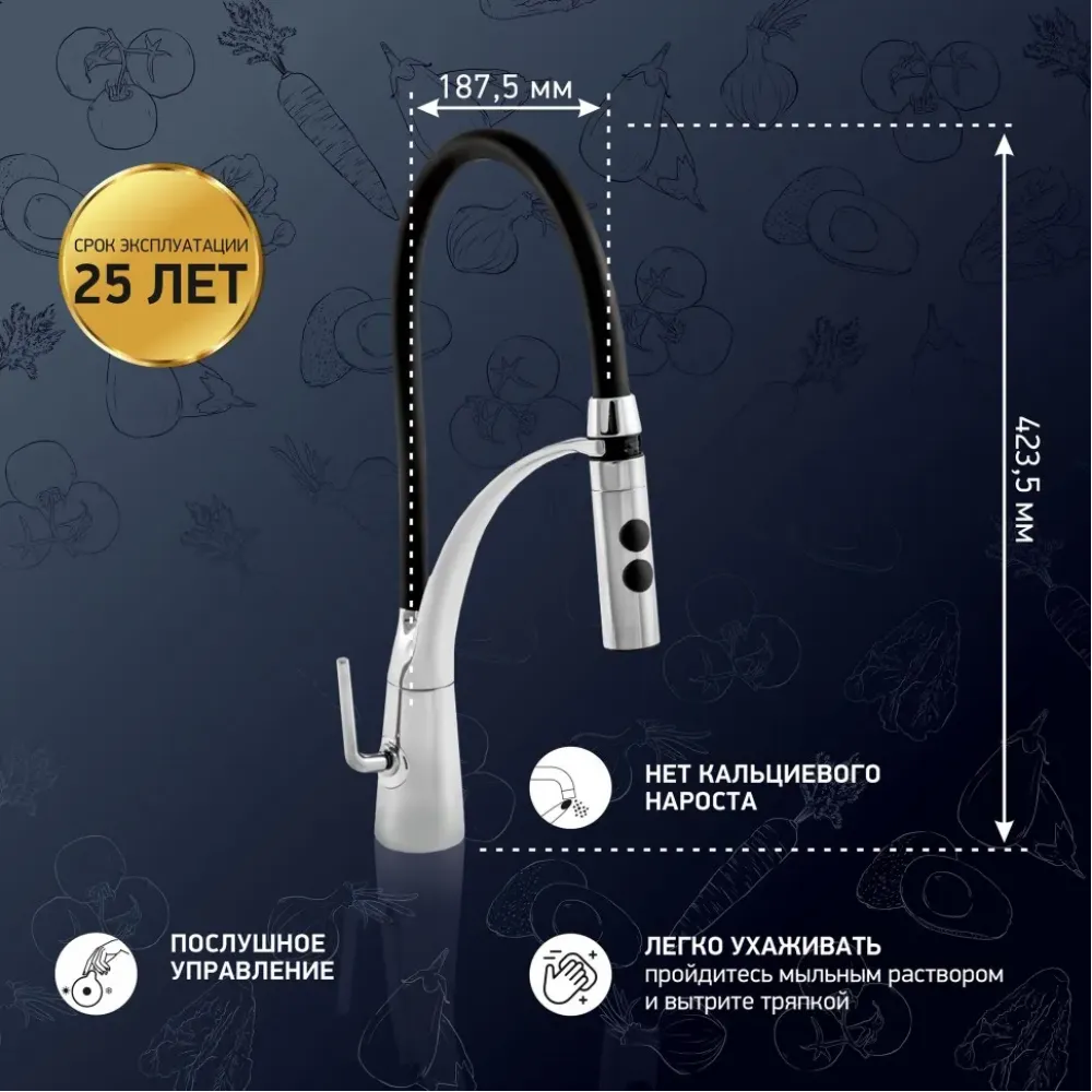 Высокий поворотный излив смесителя для кухни «ПАИНИ» позволяет менять направление потока воды, использовать глубокую посуду, а гибкая лейка удобна для того, чтобы набрать воду, помыть продукты и так далее.