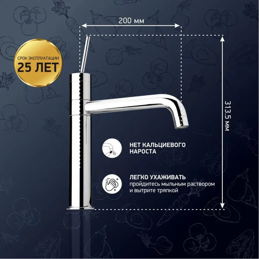 - Высокий корпус и поворотный излив дает больше возможностей при использовании на кухне.