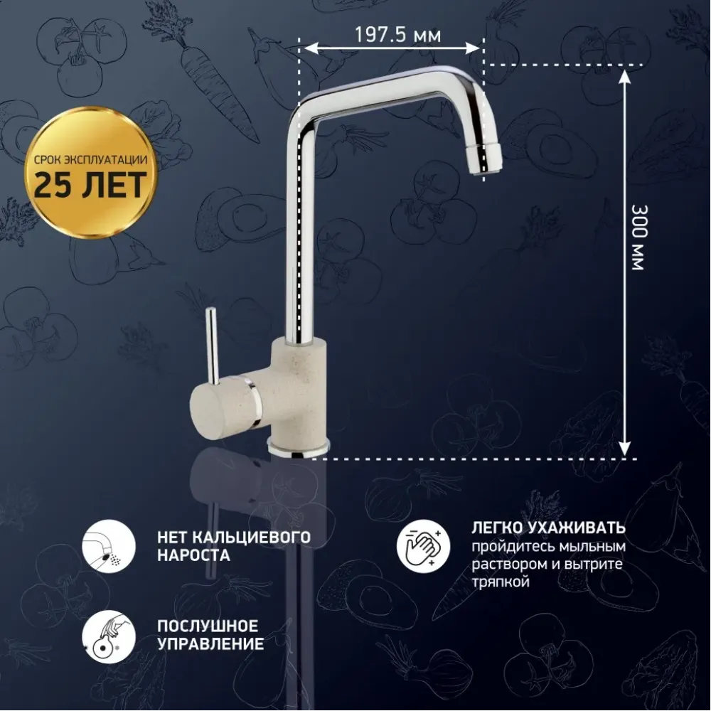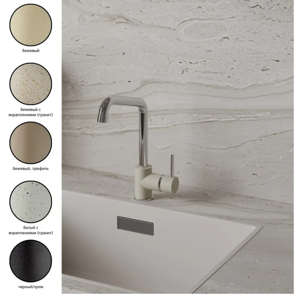 Белый с вкраплениями (гранит), комбинация черного и хромого цветов в корпусе смесителя, и три варианта бежевого цвета: сахара, бежевый с вкраплениями (гранит) и нежный трюфель. Теперь точно получится попасть в цвет столешницы и/или цвет мойки либо создать контрастные сочетания. Все варианты покрытия, включая покрытие под камень, выполнены по специальной технологии, сохраняющей цвет и фактуру надолго и облегчающей уход за смесителем.