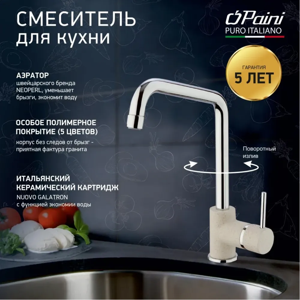 Фабрика «Паини» использует только лучшие комплектующие. Аэратор Neoperl наполняет поток воды кислородом, увеличивает напор, экономя воду. Одно движение пальцем для очистки сеточки. Керамический картридж Nuovo Galatron – основа, необходимая для долгой работы смесителя.