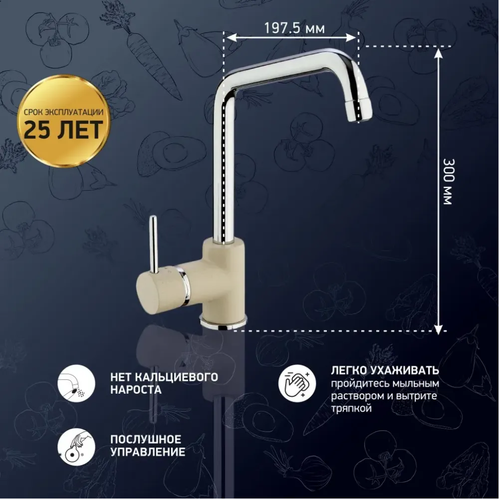 Белый с вкраплениями (гранит), комбинация черного и хромого цветов в корпусе смесителя, и три варианта бежевого цвета: сахара, бежевый с вкраплениями (гранит) и нежный трюфель. Теперь точно получится попасть в цвет столешницы и/или цвет мойки либо создать контрастные сочетания. Все варианты покрытия, включая покрытие под камень, выполнены по специальной технологии, сохраняющей цвет и фактуру надолго и облегчающей уход за смесителем.