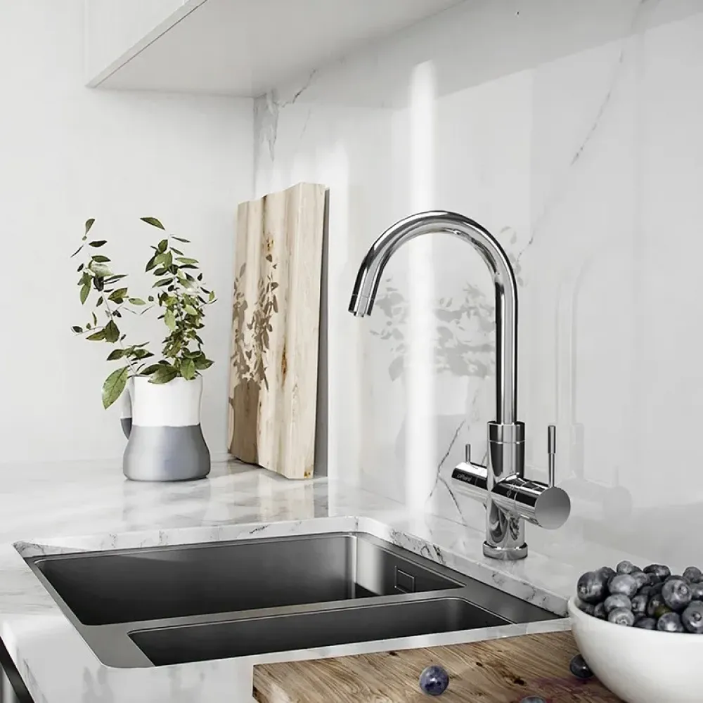 Коллекция COX выводит минимализм на новый уровень. Однорычажный смеситель идеально подходит для кухни, высокий поворотный излив позволяет менять направление потока воды, использовать глубокую посуду. В смесителе есть отдельный выход подачи питьевой воды, поэтому вам не придется предусматривать лишние отверстия на мойке для соединения фильтра и отдельного крана для очищенной воды. Тонкая эргономичная ручка в сочетании с традиционной формой корпуса сделает интерьер стильным, не перегружая его деталями. Дизайн смесителя будет органично смотреться в стилях хай-тек, модерн, классика или добавит завершающий штрих в минималистичный интерьер.