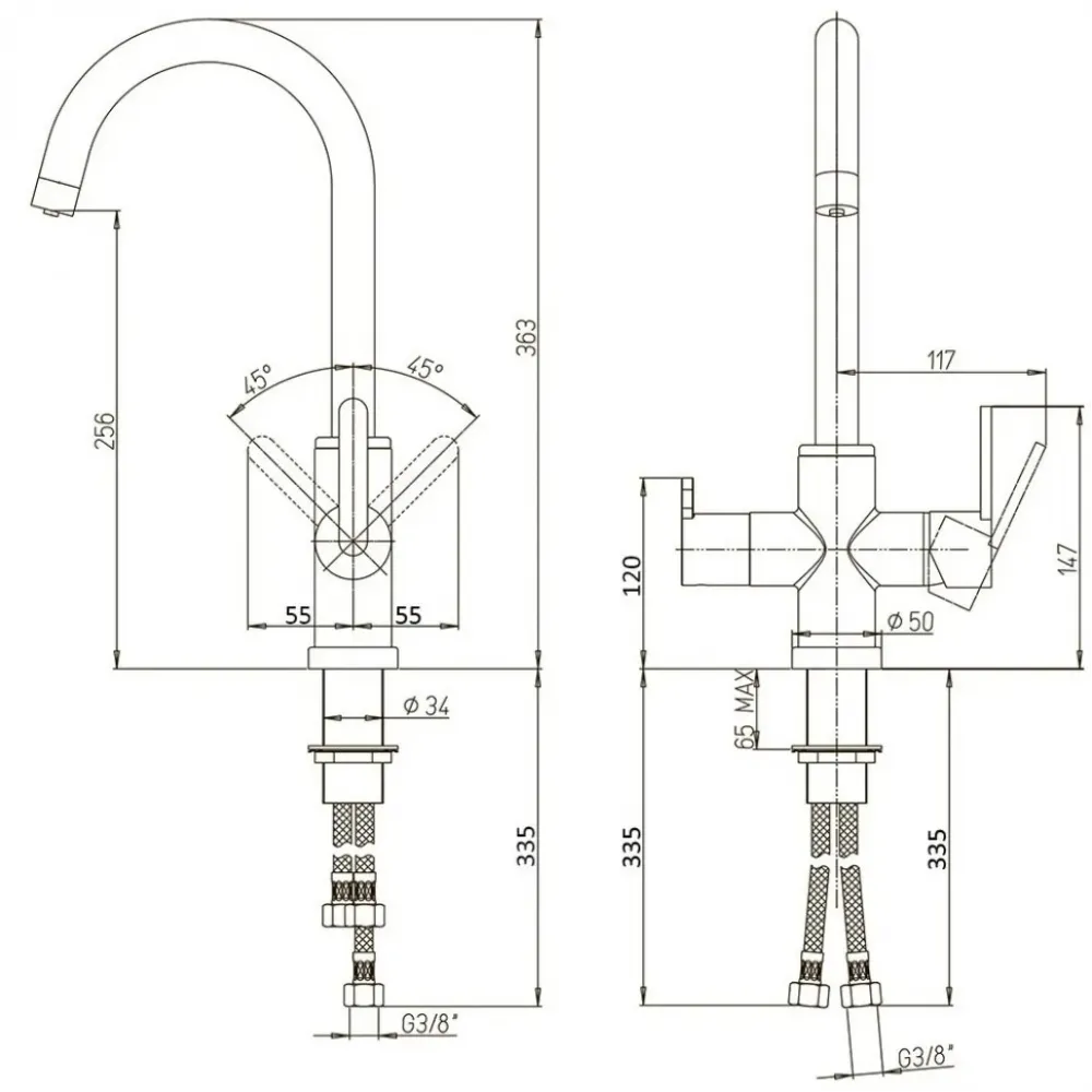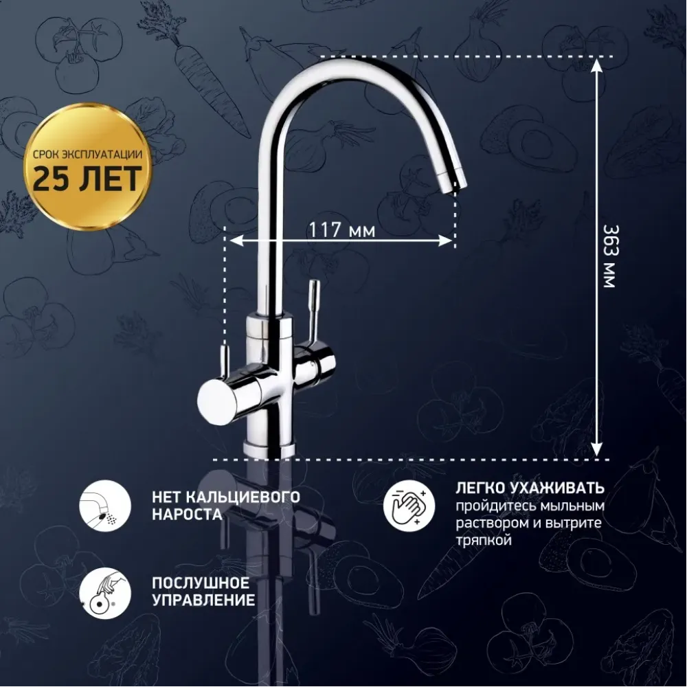 - Высокий корпус и поворотный излив дает больше возможностей при использовании на кухне.