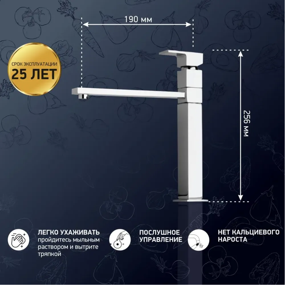 - Высокий корпус и поворотный прямой излив дает больше возможностей при использовании на кухне.