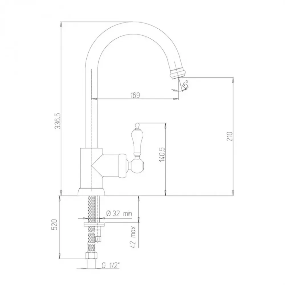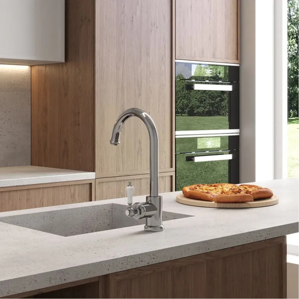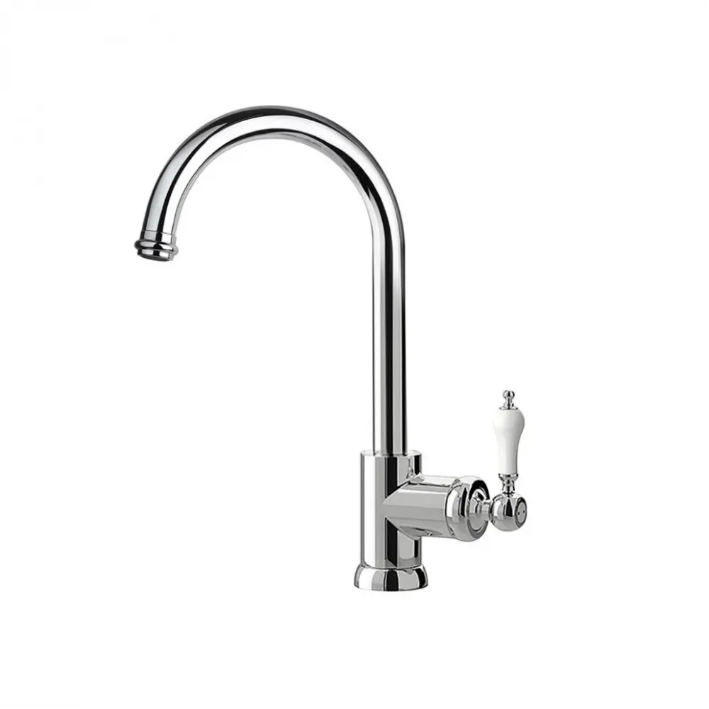 Однорычажный высокий смеситель украсит кухню, пластиковая изящная отделка ручки в сочетании с классической формой корпуса вносят элемент ретро, не перегружая интерьер деталями. Высокий корпус и поворотный излив позволят менять направление потока воды, использовать глубокую посуду. Антикварные формы DUOMO будут органично смотреться в стилях классика, винтаж или по-новому раскроют интерьер в стиле фьюжн.