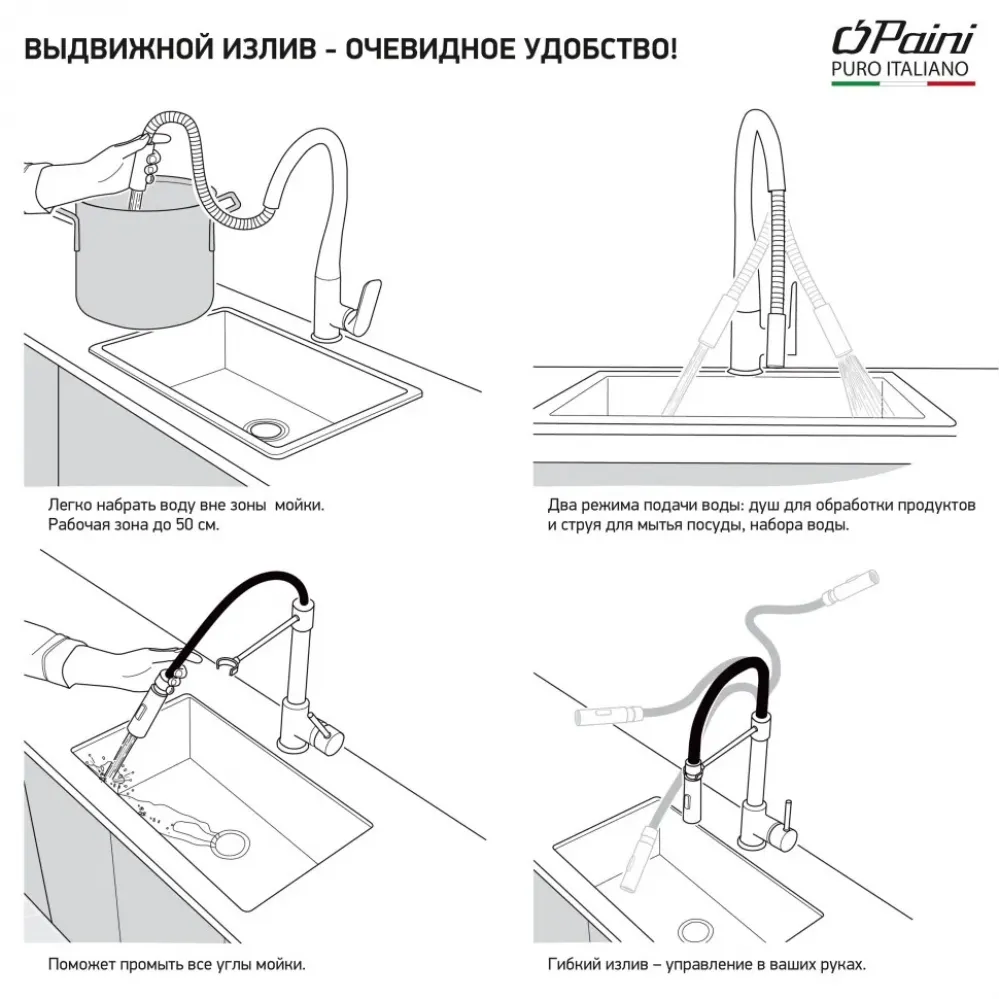 - Выдвижной излив и несколько режимов подачи воды открывают новые возможности для использования на кухне.