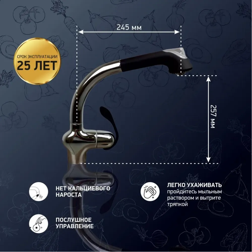 Дизайн смесителя подойдет для кухонь в стилях классика, модерн, минимализм.